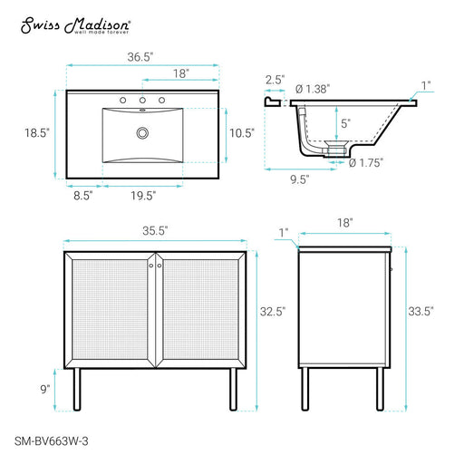 Swiss Madison Classe 36 in. White Oak Bathroom Vanity With White, 3-Hole Ceramic Sink Top - SM-BV663W-3
