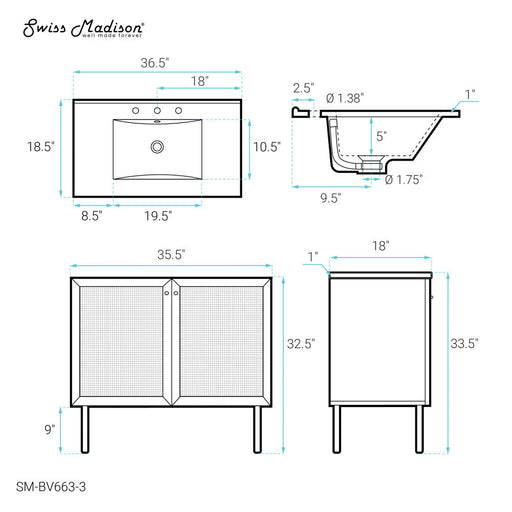 View full detailsSwiss Madison Classe 36 in. Brown Bathroom Vanity With White, 3-Hole Ceramic Sink Top - SM-BV663-3