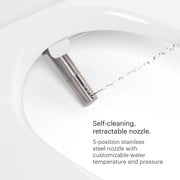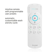 The self-cleaning, 5-position stainless steel nozzle offers a cleansing spray, with fully customizable water pressure and temperature. For added convenience, every aspect of your wash and dry is controlled using the intuitive wireless remote with programmable user settings.