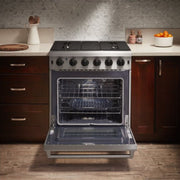 Looking for a powerful and premium professional range for a practical price? The THOR Kitchen 30" Inch Natural Gas Range, LRG3001ULP, is a stainless steel machine designed with professional features and functionality. With high-powered burners, continuous grates and a commercial convection fan, this range takes everything from prime rib to snickerdoodles to the next level.