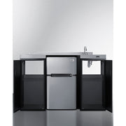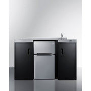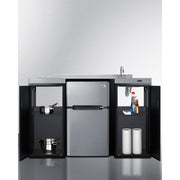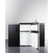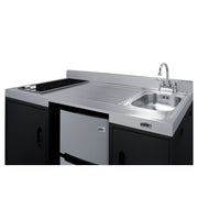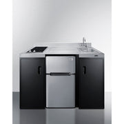 Summit brings true convenience to smaller spaces with all-in-one combination kitchenettes. Available in a variety of sizes and finishes, these units come fully featured with everything you need for the home foodservice experience, including a 2-burner smooth-top cooktop, sink, storage cabinets, and refrigerator with a freezer compartment. The CK55ADASINKR is 54" wide in an easy-fitting 24" depth. The counter is sized at 34" high to comply with ADA guidelines for user accessibility. Its black exterior brings a modern look to efficiency spaces, with added touches of stainless steel on the kitchenette work surface and refrigerator doors. This unit includes a built-in 115V smooth-top cooktop with a rear 7" 900W and a front 5½" 500W heating element. The power cord comes pre-installed for easy setup. The left side of the kitchenette features a compact sink with ready-to-use faucet. A single-door cabinet under the sink includes a removable wire shelf, perfect for storing cleaning supplies, while a French-door style cabinet under the work surface has a solid removable shelf, ideal for dry storage. Two grooved handles on each side allow for easy movement of the unit. Unlike many other brands' kitchenettes, all Summit units include a refrigerator with a freezer compartment to cover all of your cold storage needs. The CK55ADASINKR includes the two-door, ENERGY STAR certified CP34BSS, with 3.2 cu.ft. of storage space. A dual evaporator system separately cools the auto defrost refrigerator section and manual defrost freezer compartment for improved overall performance. This model also includes an adjustable glass shelf, door storage, and a crisper. The CK55ADASINKR is packaged and shipped in one box. Perfect for studio apartments, hotel rooms, dormitories, assisted living facilities, temporary kitchen facilities, and any other location in need of low maintenance, fully-featured compact kitchenette. For this unit with a sink located on the left of the kitchenette, see the CK55ADASINKL. Additional styles are available in a range of choices, as well as storage accessories including matching wall cabinets and appliance shelves.