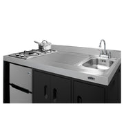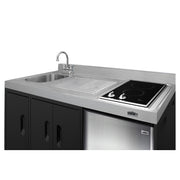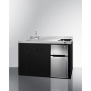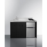 Summit brings true convenience to smaller spaces with all-in-one combination kitchenettes. Available in a variety of sizes and finishes, these units come fully featured with everything you need for the home foodservice experience, including a 2-burner smooth-top cooktop, sink, storage cabinets, and refrigerator with a freezer compartment. The CK54SINKL is 54" wide with an easy-fitting 24" depth. Its black exterior brings a modern look to efficiency spaces, with added touches of stainless steel on the kitchenette work surface and refrigerator doors. This unit includes a built-in 115V smooth-top cooktop with a rear 7" 900W and a front 5½" 500W heating element. The power cord comes pre-installed for easy setup. The right side of the kitchenette features a compact sink with ready-to-use faucet. A single-door cabinet under the sink includes a removable wire shelf, perfect for storing cleaning supplies, while a French-door style cabinet under the work surface has a solid removable shelf, ideal for dry storage. Two grooved handles on each side allow for easy movement of the unit. Unlike many other brands' kitchenettes, all Summit units include a refrigerator with a freezer compartment to cover all of your cold storage needs. The CK54SINKL includes the two-door, ENERGY STAR certified CP34BSS, with 3.2 cu.ft. of storage space. A dual evaporator system separately cools the auto defrost refrigerator section and manual defrost freezer compartment for improved overall performance. This model also includes an adjustable glass shelf, door storage, and a crisper. The CK54SINKL is packaged and shipped in one box. Perfect for studio apartments, hotel rooms, dormitories, assisted living facilities, temporary kitchen facilities, and any other location in need of low maintenance, fully-featured compact kitchenette. For this unit with a sink located on the right of the kitchenette, see the CK54SINKR. Note: For users who prefer a gas connection, Summit model GC22SS can fit inside the existing 11" W x 19 1/4" D cooktop cutout. Additionally, users can remove the center storage cabinet and install an 18" wide ADA compliant dishwasher, such as Summit model DW18SS4ADA. See the instructions in the "DOWNLOADS" section of this page.