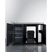 Bring new convenience to outdoor entertainment with Summit's fully featured selection of mobile outdoor kitchenettes. Model CARTOS54RS is a 58 inch wide mobile cart that comes fully featured for backyard entertaining. We include our popular ENERGY STAR certified all-refrigerator (model SPR196OSADALHD) for efficient, weatherproof storage of food and beverages. The refrigerator features a stainless steel door complete with a front lock, allowing you to secure items when not in use. Next to the refrigerator, two jet black cabinet doors protect your full-extension slide-out waste receptacle. We include two plastic bins that fit perfectly inside. The stainless steel work surface offers plenty of room for mixing beverages or prepping your party. A recessed cutout features a removable cutlery tray that can be covered with our durable cutting board, letting you maximize useful counter space. The right side includes a sink compartment that can be connected to your garden hose to dispense cold water. We also include a removable clear dome that covers your sink, allowing you to create your own ice bucket system to keep items chilled and protected from pests. We supply a waste drain bottle that can easily be installed under the sink area and emptied as needed. For smooth portability, the CARTOS54LS is equipped with four heavy duty caster wheels (front two are locking) and a stainless steel towel bar handle for easy steering. A stainless steel speed rail is installed on the right side for convenient dry storage. This unit is constructed from stainless steel and powder-coated metal. We include a vinyl cover to help protect the unit from the elements when not in use. In addition to this unit, we also manufacture a cart with a glass door beverage center (model CARTOS54RG), as well as a full assortment of built-in outdoor refrigerators, freezers, kegerators, icemakers, and more. Browse the full Summit product line to discover the perfect solution for any outdoor kitchen space.