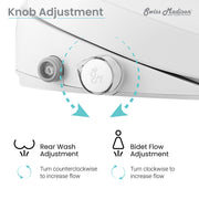 - Features Include: Adjustable Male Wash, Adjustable Female Wash, Manual adjustable Water Pressure, No electricity needed, Self-cleaning nozzle, Soft-Close Seat