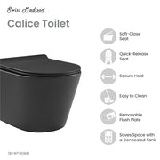 Embrace modern minimalism with the Calice collection, where each piece channels simplicity and sophistication. Optimize space and aesthetics with our wall-mount toilets, offering a clean and polished look with seamless integration. Offered in black with a matte finish.