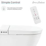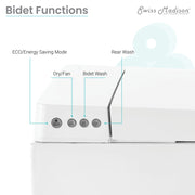 - Features Include: Wireless Remote Included, Adjustable Water Temperature, Adjustable Water Pressure, Adjustable Heated Seat, Adjustable Male Wash, Adjustable Female Wash, Heated Drying Fan, Self Cleaning Nozzle, Night Light, Soft-Close Seat, Eco mode, Seat sensor flush, Remote flush