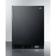 SUMMIT's selection of break room refrigeration features a variety of units for convenient and reliable storage in hospitals, clinics, and other facilities. The BKRF663B is a counter height refrigerator-freezer made in Europe and sized with a 24" footprint. It features a black exterior finish and stainless steel handle, with a user-reversible door swing for added flexibility. A factory-installed NIST calibrated thermometer is located in the kickplate to provide a continuous display of the current and high/low temperatures of the refrigerator compartment to the nearest tenth of a degree. Temperature can be viewed in Celsius or Fahrenheit for added convenience. The device also includes an audible alarm to warn of major temperature fluctuations. Inside, the BKRF663B features a dual evaporator to allow separated cooling of the fresh and frozen food sections. The refrigerated compartment utilizes low maintenance automatic defrost, while the interior freezer compartment is manual defrost to achieve lower storage temperatures ideal for frozen food. Additional features include adjustable glass shelves, a crisper drawer, door racks for condiments and tall bottles, and an automatic interior light. The BKRF663B is designed for freestanding use. For a built-in version, see the BKRF663BBI. Additional styles and ADA compliant sizes are available. Note: Model prefix "BKRF" is a marketing designation. Actual unit will carry Summit model number CT663B.