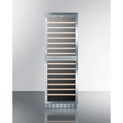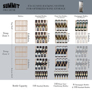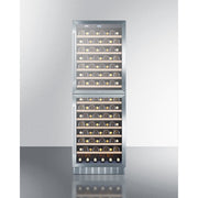 SUMMIT SWC1875B is a built-in capable two-zone wine cellar designed to store up to 118 bottles. With an easy-fitting 24" footprint, the SWC1875B can be used built-in or freestanding and features two distinct temperature zones, each with its own reversible glass door. Store white and sparkling wine in the upper zone while preserving your reds below at a warmer temperature. Two digital thermostats let you set the proper conditions for your collection, with a digital readout in Fahrenheit or Celsius. Inside, the SWC1875B includes 14 slide-out wooden shelves to properly hold bottles. Store up to 118 standard 750ml Bordeax style bottles, or 118 wider Burgundy style bottles (generally used for Chardonnay or Pinot Noir). If storing champagne, the top shelf can hold 8 bottles. Recessed LED lighting offers an attractive display and a factory installed lock ensures the security of your collection. This model has a jet black cabinet with stainless steel trimmed glass doors. Professional chrome handles and a stainless steel kickplate complete the elegant look.