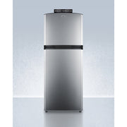 SUMMIT's selection of break room refrigeration features a variety of units for convenient and reliable storage in hospitals, clinics, and other facilities. Made in North America, the BKRF14SS is a full-sized refrigerator-freezer specifically designed for use in break rooms and other common areas. The large interior offers 12.9 cu.ft. of storage capacity. A dial thermostat located inside affords easy temperature management, with two NIST calibrated thermometers externally mounted on top of the unit to provide a temperature readout of the current and high/low temperatures in each section to the nearest tenth of a degree. Temperature can be viewed in Celsius or Fahrenheit for added convenience. Each thermometer includes an audible high/low alarm function to warn users if the refrigerator or freezer section goes out of the specified temperature range. Inside, the BKRF14SS utilizes frost-free operation for easy user maintenance. Both the refrigerator and freezer compartments include adjustable spill-proof glass shelves and door racks for easy storage. A large crisper drawer helps keep your greens fresh. The refrigerator section includes an automatic interior light for an easy view of stored contents. The BKRF14SS features a black exterior cabinet, as well as reversible stainless steel doors and handles. This unit is available with a left-hand door swing (see the BKRF14SSLHD), as well as with white (see the BKRF14W) and black (see the BKRF14B) doors. Visit summitappliance.com to view the complete collection.