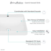 Embrace geometric balance with the Carre collection, where clean lines and modern design principles take center stage. Elevate your bathroom aesthetic with our vessel sinks, blending artistry and utility to create a stunning statement piece. Offered in white with a glossy finish.