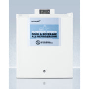 Accucold's Nutrition Center Series features commercially approved refrigerators and freezers specifically designed for the storage of sealed food and beverages in a variety of facilities, including break rooms, waiting areas, nurses' stations, and more. The FFAR25L7NZ is a compact all-refrigerator for countertop use. It is ETL-S listed to NSF-7 standards, with a temperature range of 35 to 39ºF ideal for sealed food and beverage storage. The top includes a continuous external display of the current and minimum/maximum temperature to the nearest tenth of a degree, making it easier for staff to monitor and record the temperature as needed. This device includes a built-in audible alarm that will sound if the unit rises or falls out of the set temperature range. The temperature probe is encased in a glycol-filled bottle to best simulate the temperature of stored contents. All temperature display devices are calibrated to NIST standards in our ISO/IEC 17025:2017 laboratory and include a certificate of calibration. Inside, the FFAR25L7NZ utilizes low maintenance automatic defrost operation. Two adjustable chrome shelves allow users to reconfigure the interior to accommodate a variety of sizes, with a flat door liner to allow easier storage of deeper items. The flat door liner helps to maximize the interior depth. The digital thermostat is located inside and can be managed in Celsius or Fahrenheit. Interior LED lighting offers an attractive, energy efficient view of the interior in a soft blue hue. The FFAR25L7NZ comes in a white exterior finish. The user-reversible door includes a front lock for keyed security. The rear features a sealed metal cover for easier cleanup, ensuring dust and other particles won't affect the cleanabililty of the exterior. Designed specifically for institutional food and beverage storage, all Accucold's Nutrition Centers are commercially approved to NSF standards and comply with most JCAHO recommendations for safe storage. Additional sizes and variations are available.