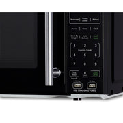 Compact microwave in black with window, stainless steel handle, and digital controls for easy operation