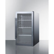 Summit's line of outdoor appliances includes slim-fitting display beverage centers designed for optimum storage and product presentation. The SPR488BOSCSS features a versatile design that meets NSF-7 and UL-471 commercial standards, but is also approved for residential use. Sized at just 19 inches wide and 17 inches deep, it features a stainless steel cabinet with a sealed back for safe installation in the outdoors. The user-reversible double pane tempered glass door includes a seamless stainless steel trim and a pro-style handle. A factory-installed lock offers added security, while the space-saving right-angle plug and integrated hinge provide added flexibility in unit placement. Two leveling legs keep the unit level on uneven surfaces. Inside, the SPR488BOSCSS utilizes an internal fan to ensure the interior is evenly cooled from top to bottom, while the automatic defrost system allows for minimal user maintenance. LED lighting allows full visibility of stored items in the jet black interior. Three adjustable glass shelves with six positions provide optimal storage capacity inside the 3.1 cu. ft. interior. The dial thermostat, with seven temperature settings, is located in the upper-right corner for easy temperature management. The SPR488BOSCSS can be installed indoors or outdoors and is designed for built-in or freestanding use. For this unit with a panel-ready door, see the SPR488BOSCSSPNR.
