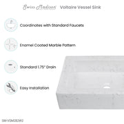 Embrace timeless elegance with the Voltaire collection, fusing classic charm with contemporary comfort. Elevate your bathroom aesthetic with our vessel sinks, blending artistry and utility to create a stunning statement piece. Offered in marbled white with a glossy finish.